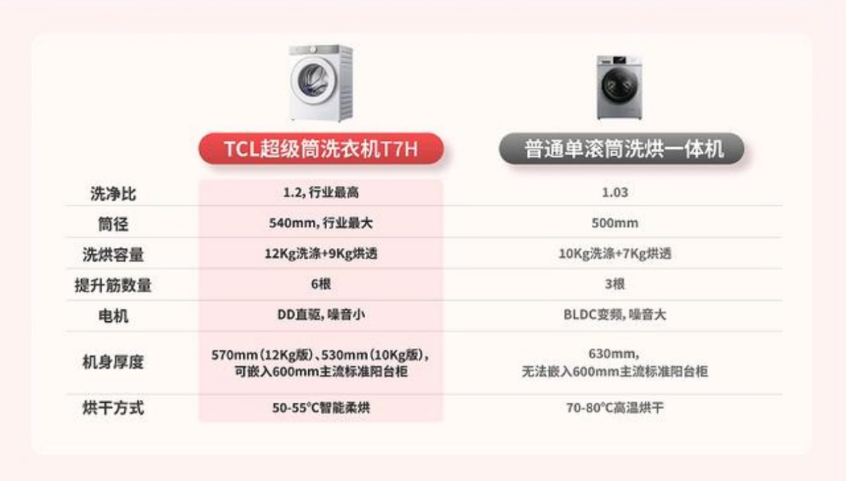 TCL聚焦“洗净比”,在科技研发、智能制造、用户体验等方面潜心研发,TCL超级筒洗衣机全系洗净能力突破行业上限,洗净比达到 1.2。