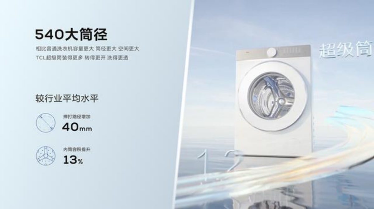TCL聚焦“洗净比”,在科技研发、智能制造、用户体验等方面潜心研发,TCL超级筒洗衣机全系洗净能力突破行业上限,洗净比达到 1.2。