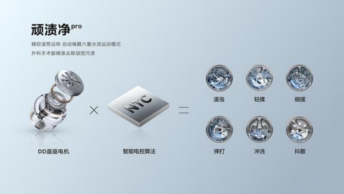 顽渍净pro采用48组磁极的DD直驱电机,精准控制洗衣机滚筒,实现对水流的精准控制,实现“六重水流运动模式”,提供“浸泡、轻揉、细搓、摔打、冲洗、抖散”六种不同的洗涤模块,通过电控算法和洗涤模块的组合,控制水温、流速、转向,洗涤方式量身定制,实现外科手术级别的顽渍清除。