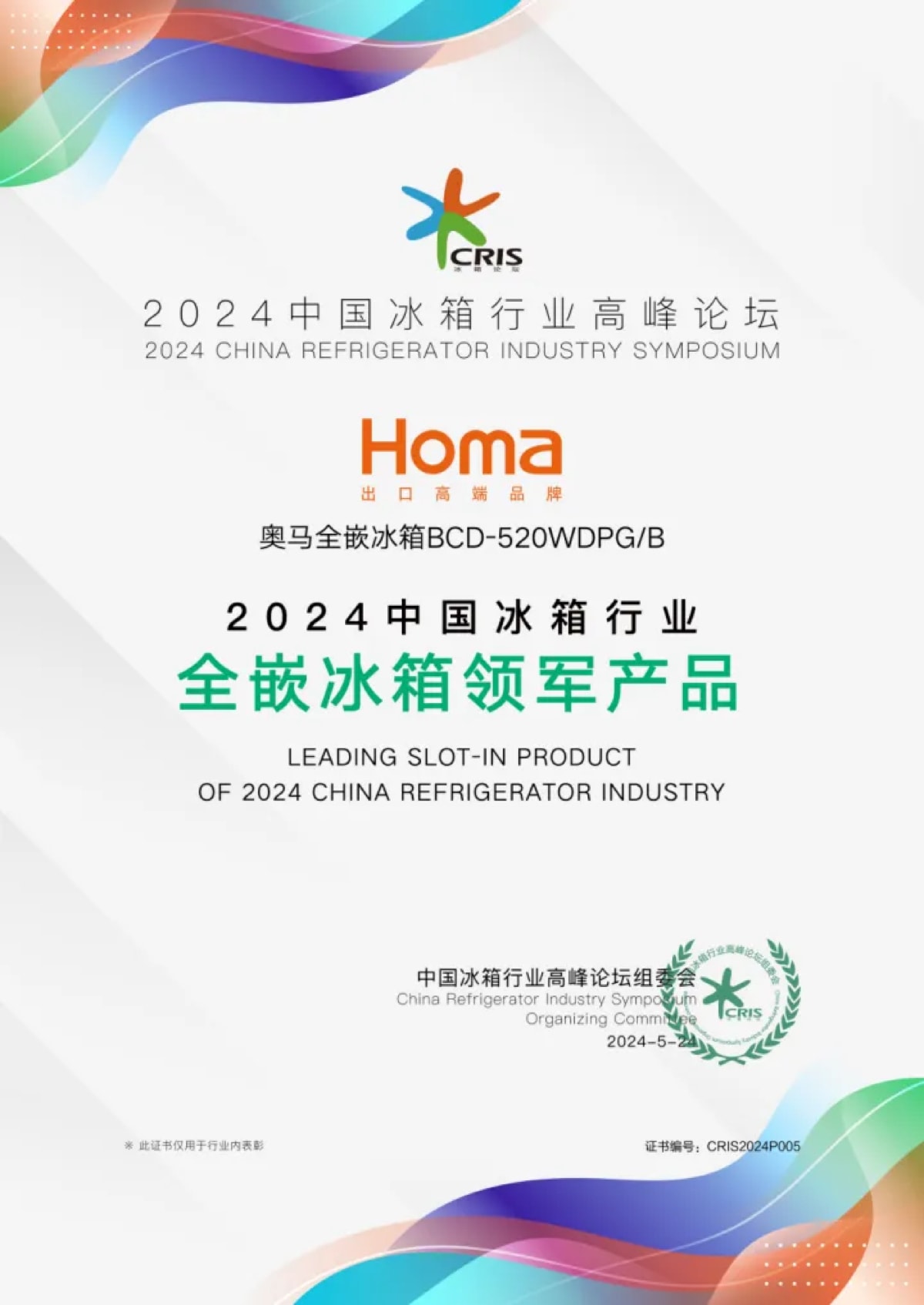 在这个行业盛会上,奥马作为冰箱赛道的领军者,凭借其卓越的产品力和创新力脱颖而出,一举斩获2024年中国冰箱行业“出口高端品牌”和“全嵌冰箱领军产品”双项大奖,充分彰显了其在行业内的领先地位。