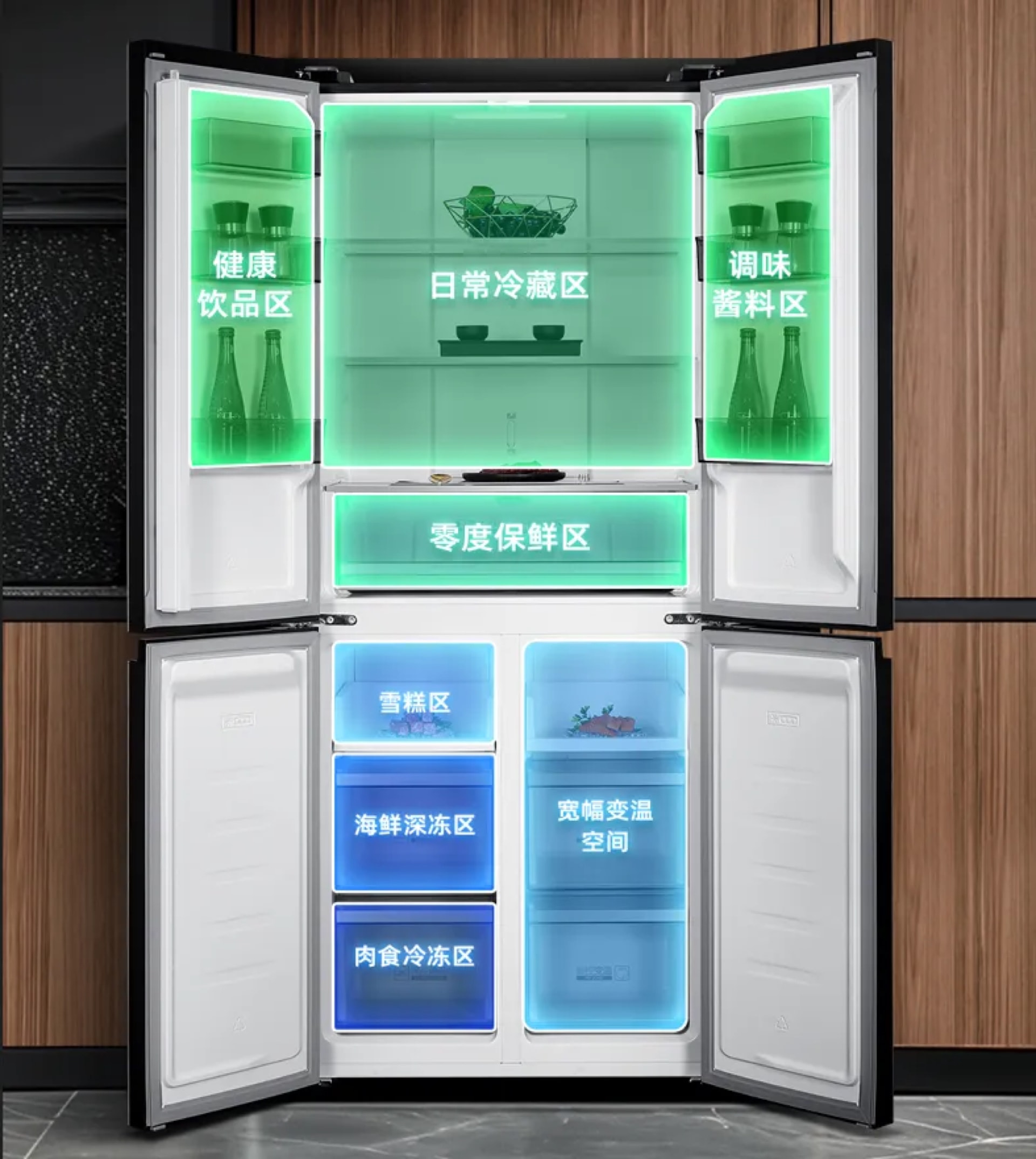 3、宽幅变温空间: 奥马439全嵌冰箱配备大容积的超宽幅变温空间,能够在-20℃~5℃之间随意调节、精准控温,无论是需要黄金4℃储存的母乳、还是宝宝的辅食肉泥,多样化的储存空间,特别适合母婴家庭的全阶段需求。