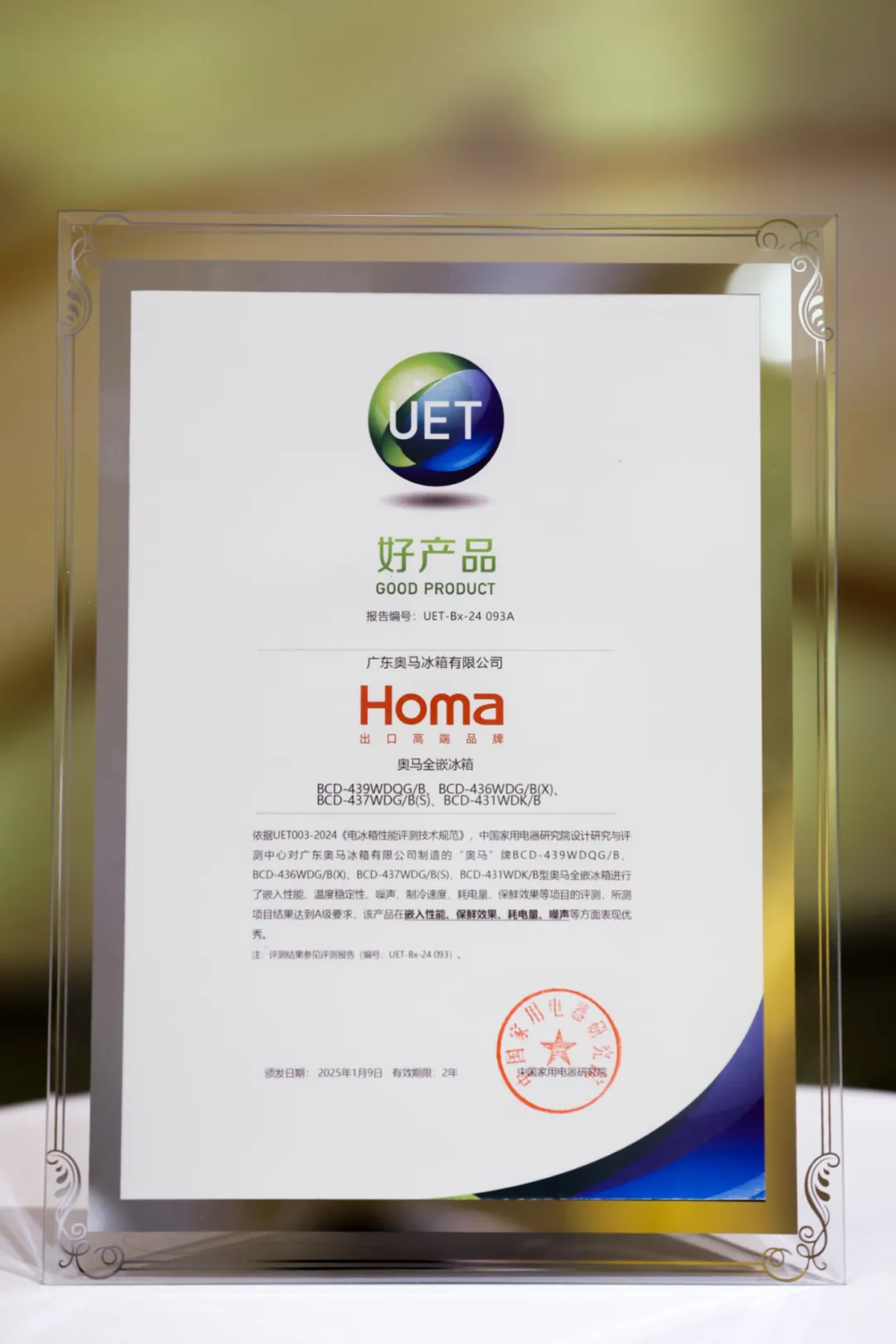 此次认证以其严格的评审标准和权威的评价体系,成为衡量家电产品品质与创新的重要标志。奥马439全嵌冰箱进行了家电院的多项专业测评,所测项目结果达到A级要求,在嵌入性能、保鲜效果、耗电量、噪声等方面表现优秀,荣膺“好产品认证”荣誉。这一奖项不仅是对产品的高度认可,更彰显了奥马冰箱在全嵌式冰箱领域的技术领先地位和品牌影响力。
