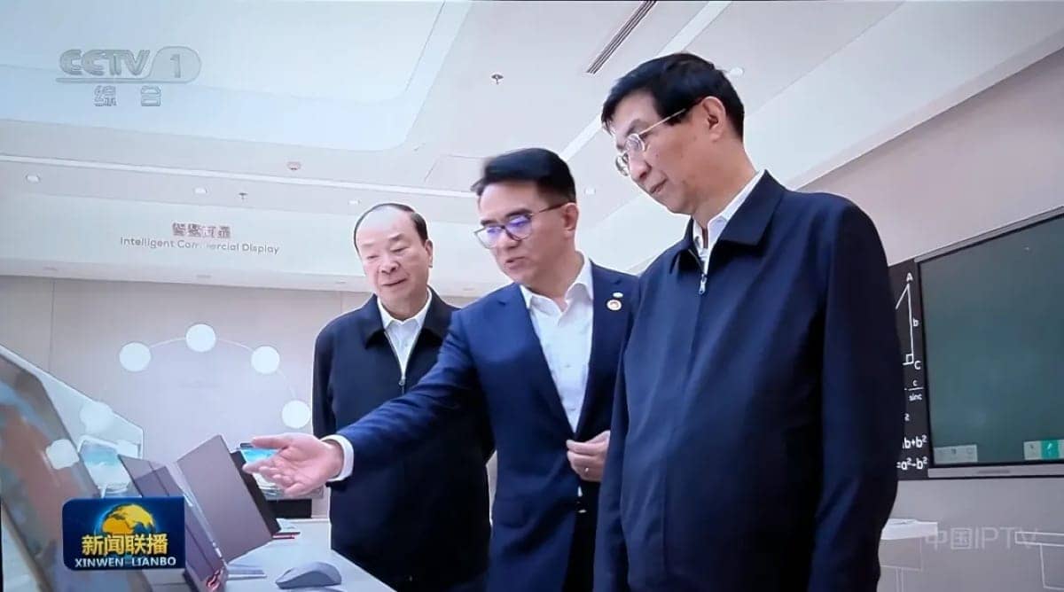 随后,王沪宁一行走进TCL华星产品展厅,听取了企业对各类显示终端、智能家电、雷鸟AR眼镜、人形机器人AiME、半导体硅片等创新成果的介绍,并重点体验了32吋8K裸眼3D显示屏、28吋喷墨打印OLED三折叠屏等核心产品。展厅考察结束后,王沪宁一行穿上防静电服和防尘帽,深入模组生产线车间,近距离察看自动化生产设备运行状态,了解了生产流程管控情况。